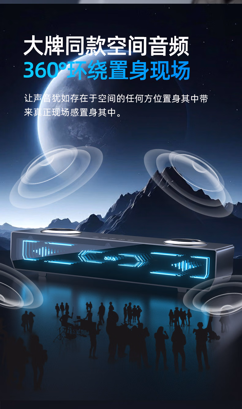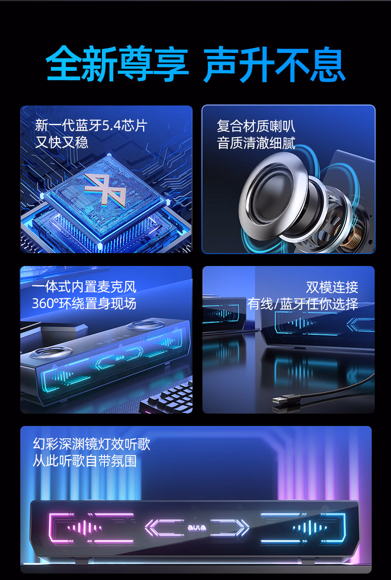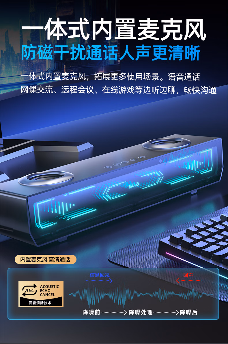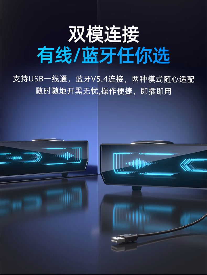 AD100电脑桌面音响音箱家用台式有线蓝牙5.4立体声效双模长条方形音箱内置麦克风 【双模连接高清麦克风】黑色
